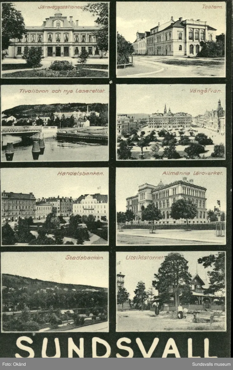 Vykort med motiv över Järnvägsstationen, Teatern, Tivolibron och Nya lasarettet, Vängåvan, Handelsbanken, Allmänna läroverket, Stadsbacken och Utsiktstornet i Sundsvall.