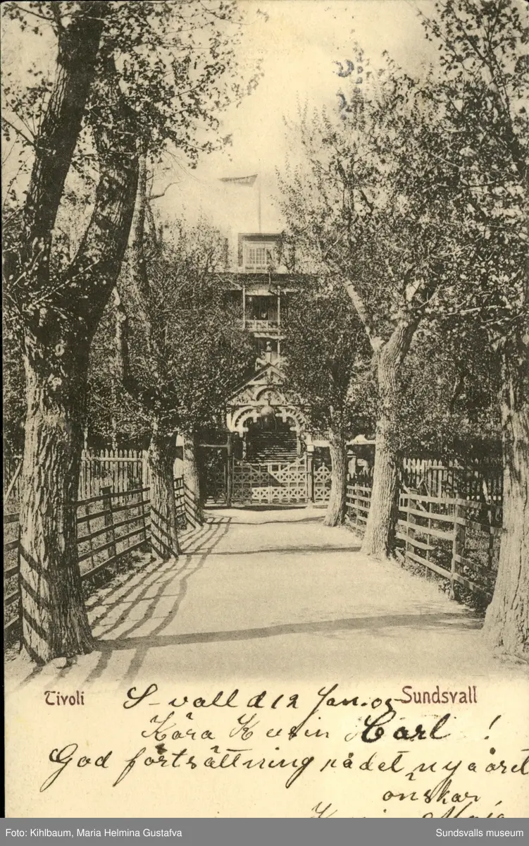 Vykort över entren till utvärdshuset Tivoli i Sundsvall.