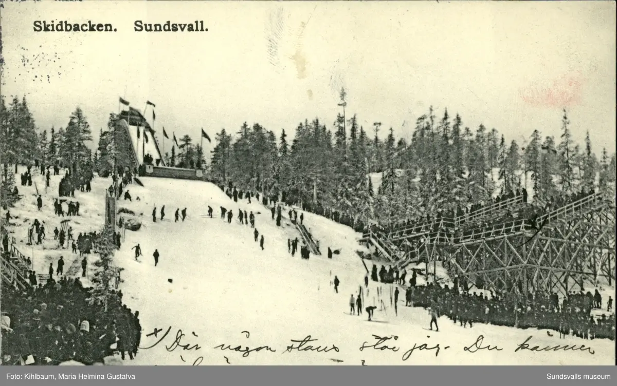 Vykort med motiv över vinteridrottsfesten i Sundsvall. Med texten: Skidbacken Sundsvall.
