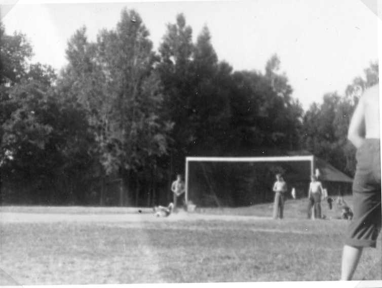 Amerikansk fotboll på Åsavallen i Gränna. I bakgrunden ett fotbollsmål och dansbanan.