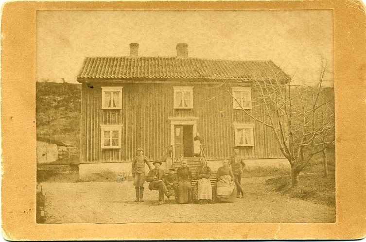 Möjligen familjen Lindberg på gårdsplan framför Mellby Matsagård. På en bänk sitter en äldre man med långskaftad pipa intill en liten pojk och tre kvinnor. Vid vardera änden av bänken står en yngling. Vid farstukvisten står en annan kvinna med ljust förkläde.