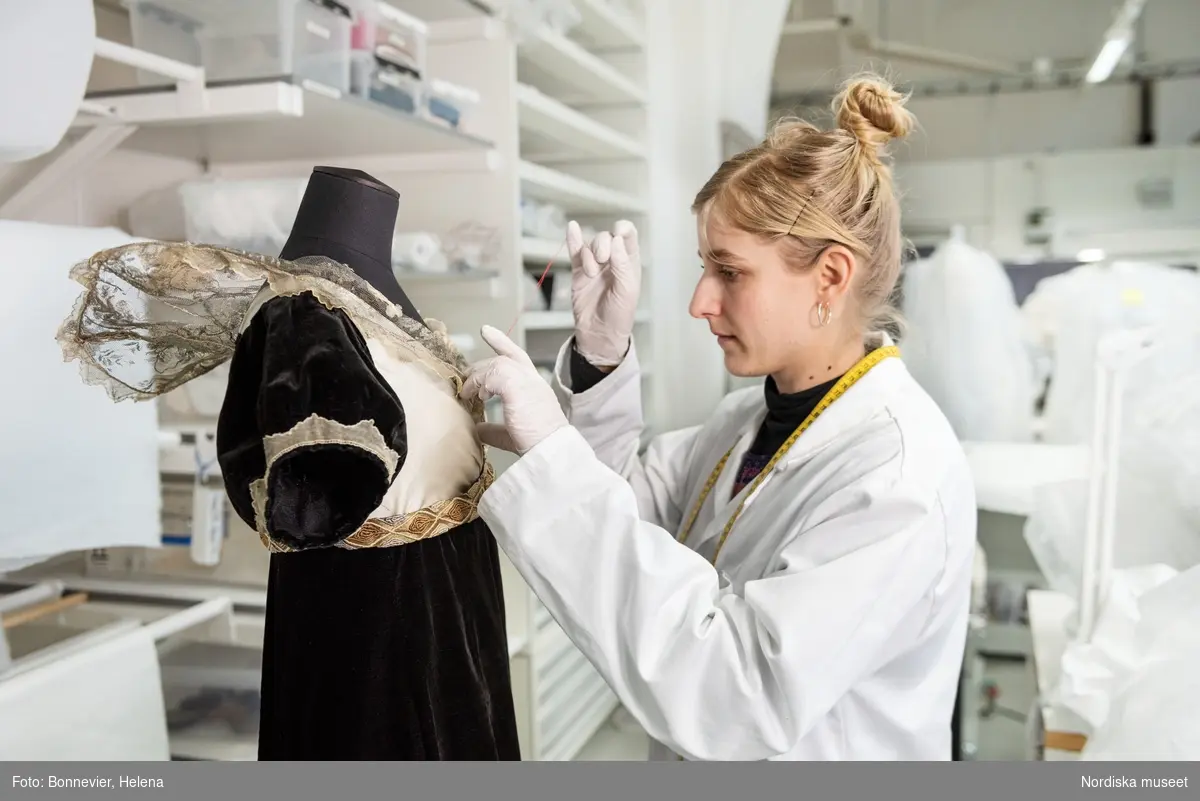 Bakom kulisserna inför utställning "Nordens Paris" om NK:s Franska damskrädderi 1902-1966. Museets konservatorer arbetar med montering av plagg som ska ställas ut.