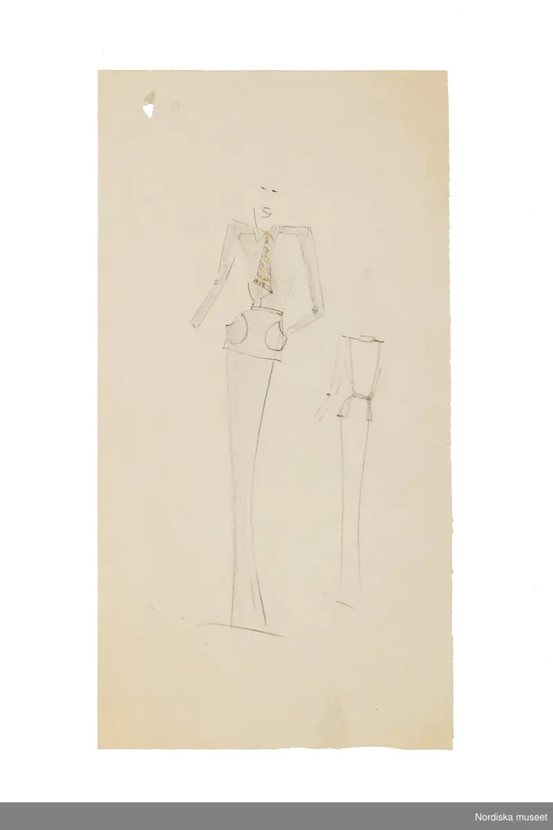 Modeskisser utförda av Pelle Lundgren (1896-1974) kreatör, från 1923 förste försäljare och senare ateljéchef på NK:s Franska damskrädderi. Från 1965 till stängningen av verksamheten 1966 var han disponent. Pelle Lundgrens minnesskisser från de kända modehusen i Paris är tecknade efter visningarna, i ritblocket eller på det som fanns till hands som hotellets brevpapper. De snabba skisserna inspirerade ateljéns egna modeller. Här ses några av de modeller som skapats för filmens och teaterns räkning. Bland skisserna finns bland annat teckningar av Zarah Leanders sparsmakat glamourösa scenkostymer som bländade publiken på Theater an der Wien 1936 och middagsklänning från vårens kollektion 1941. Slaget på den svarta middagsklänningen bildar en slips som är broderad med guldpaljetter och strass. Klänningen bars av Karin Ekelund Sachs i filmen Bara en kvinna samma år.