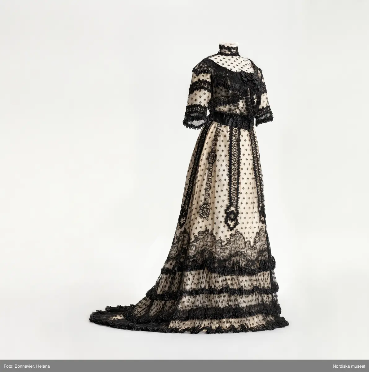 Tvådelad, korsetterad klänning av vit taft överdragen av svart tyll och spetsar. Klänningen bars av Lydia Maria Bring född Widman (1855-1939) vid en fest på Gripsholm 1904.