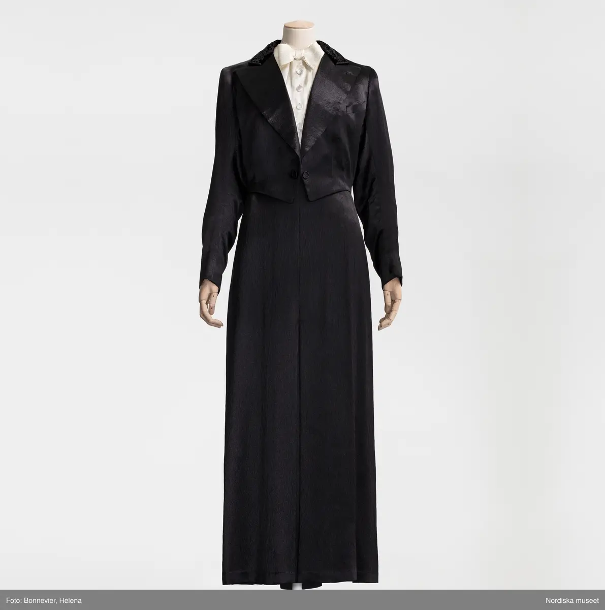 Professorsfrack av siden i tidstypiskt snitt med lång, slank kjol. Beställd från NK:s Franska damskrädderi 1937 av Nanna Svartz (1890-1986) läkare, medicine doktor och 1937 Sveriges första kvinnliga professor vid svensk högskola. Fracken bars med crèmefärgad knytblus av siden med pärlemorknappar. Läkarkårens emblem är broderat på akademikragen av sammet.