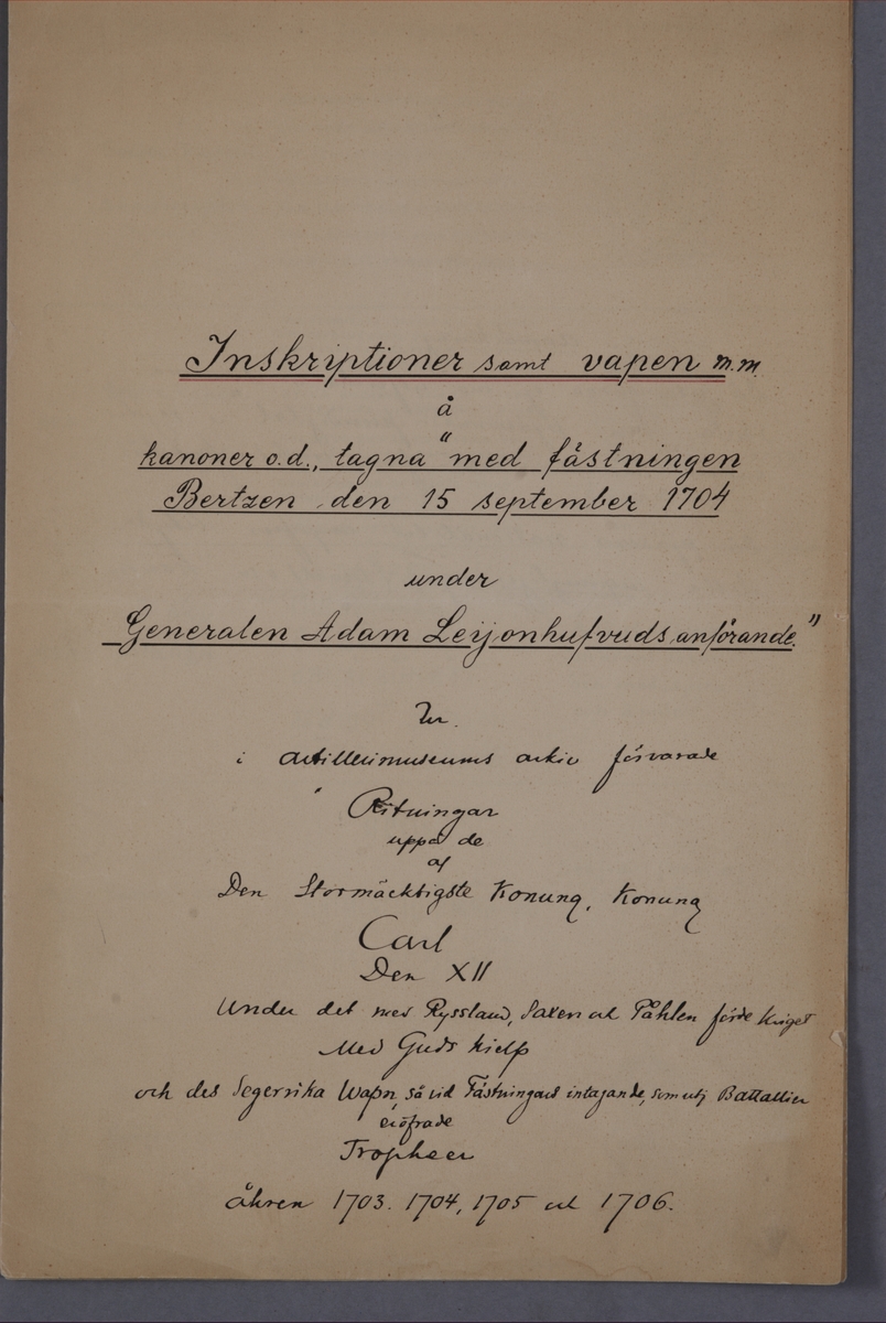 Register, med inskriptioner och vapen till kanoner tagna med fästningen Bertzen den 15 september 1704, till bokverk med avbildningar föreställande eldrör tagna som troféer av den svenska armén åren 1703-1706, utförda av syskonen Anna Maria och Philip Jakob Thelott.