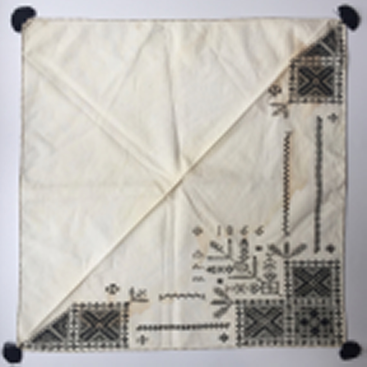 Geometriskt mönster i kvadrater i hörnen huvudsakligen i rätlinjig plattsöm. Två bårder mellan kvadraterna på ryggsnibb och framsnibbar. På ryggsnibben tre kvadrater och en majstångsspira samt märkning med årtal och initialer. På varje framsnibb en kvadrat och en trekant. Åtta ornament