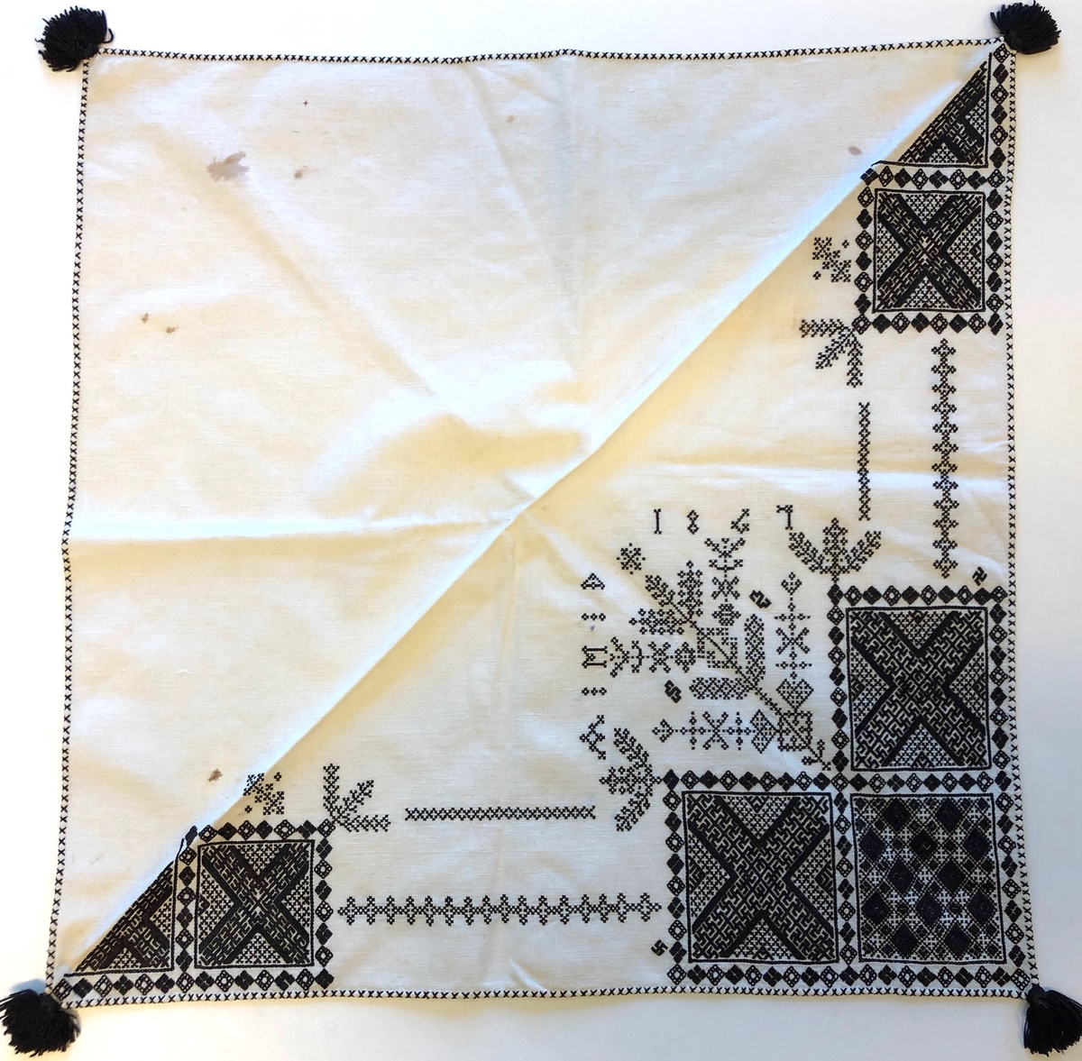 Geometriskt mönster i huvudsak i rätlinjig plattsöm i kvadrater i hörnen. Två bårder mellan kvadraterna på ryggsnibb och framsnibbar. På ryggsnibben tre kvadrater och en majstångsspira samt märkning med årtal och initialer. På varje framsnibb en kvadrat och en trekant. Fyra ornament