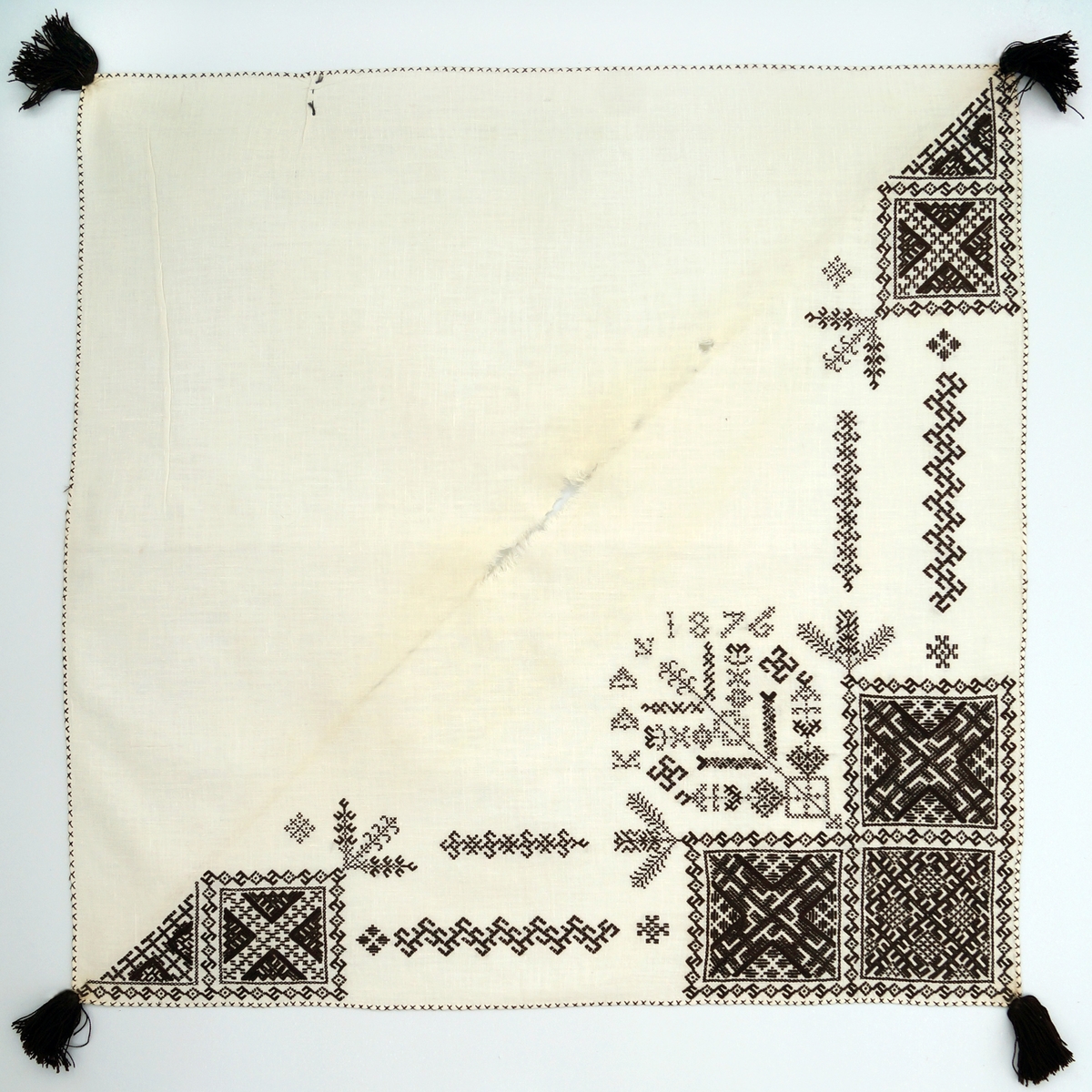 Ornament: Svastikaliknande och olika figurer i plattsöm och korsstygn
