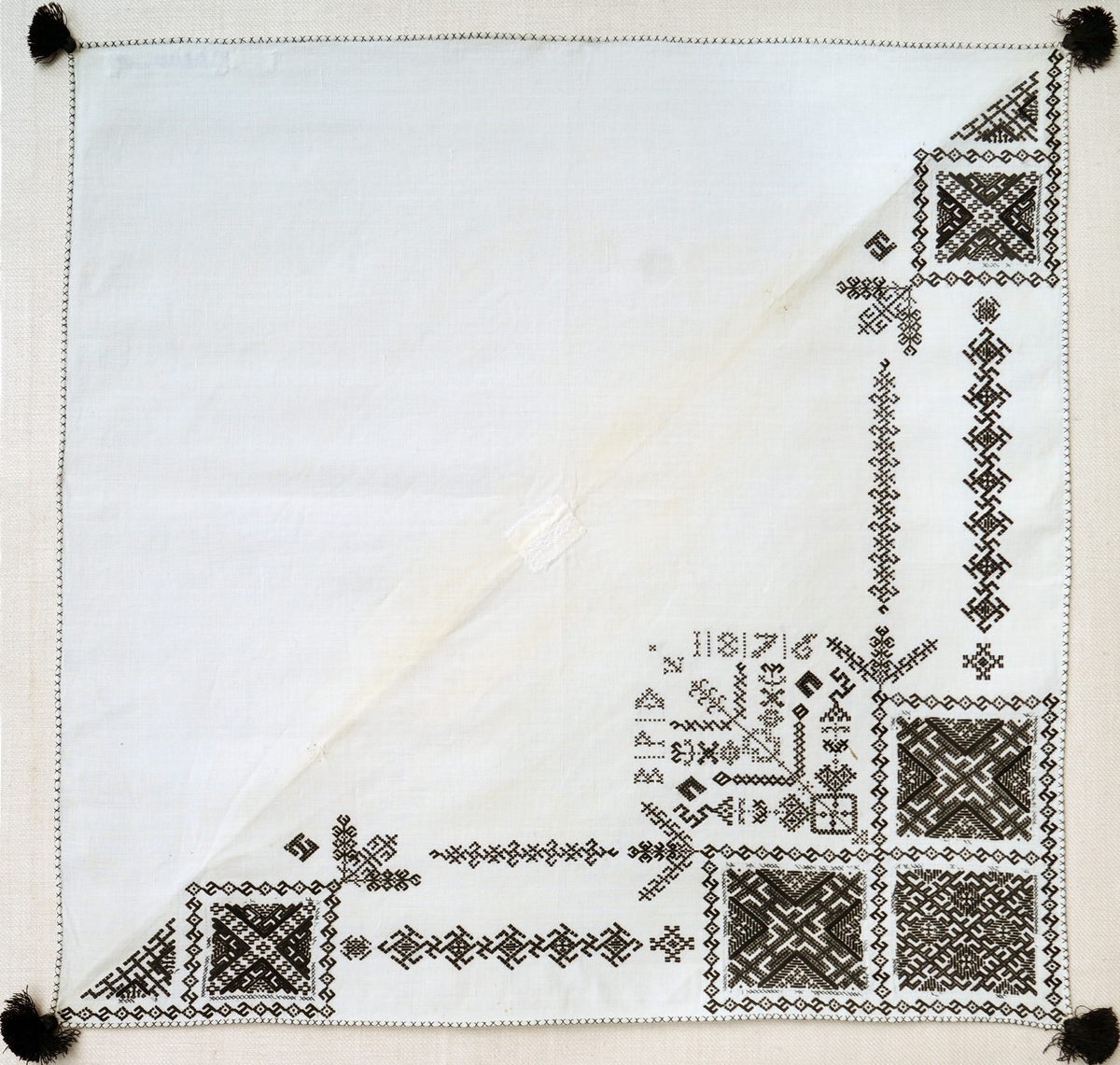 Geometriskt mönster i kvadrater i hörnen, bårder, mellan kvadraterna på ryggsnibb och framsnibbar, svastikliknande. På ryggsnibben tre kvadrater och en majstångsspira rikt dekorerad samt märkning med årtal och initialer. På varje framsnibb en kvadrat och en trekant.