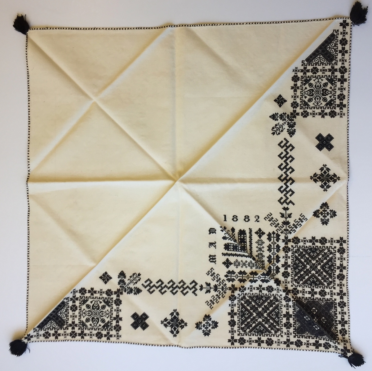 Blomsterliknande mönster i kvadraterna och i bården runt kvadraterna. En rikt dekorerad majstångsspira samt en bård mellan kvadraterna på ryggsnibb och framsnibbarna. Åtta stora ornament.