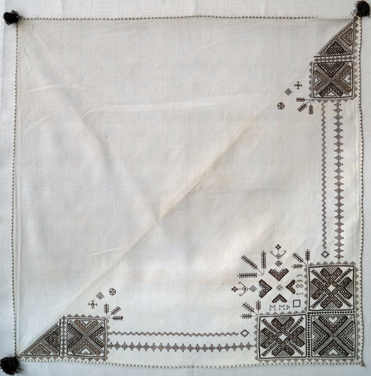 Geometriskt mönster i kvadrater i hörnen, bårder mellan kvadraterna på ryggsnibb och framsnibbarna.
