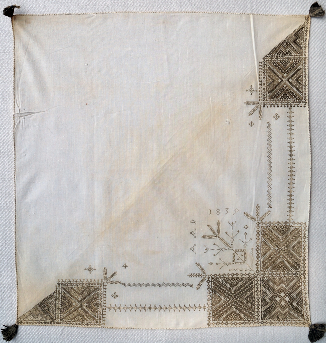 Geometriska motiv i kvadrater i hörnen, bårder mellan kvadraterna på ryggsnibb och framsnibbar.