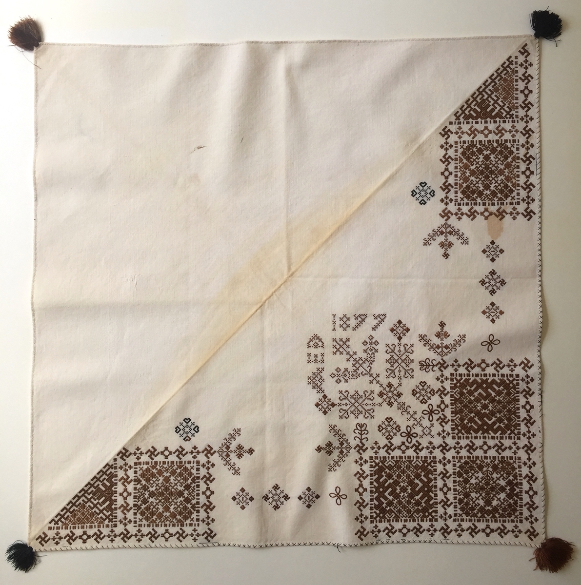 Geometriskt mönster i kvadrater i hörnen, bårder mellan kvadraterna på ryggsnibb och framsnibbar. På ryggsnibben tre kvadrater och en majstångsspira dekorerad med svastika och kvistar samt märkning med årtal och initialer. På varje framsnibb en kvadrat och en trekant. Två ornament mellan kvadraterna i blåsvart färg.