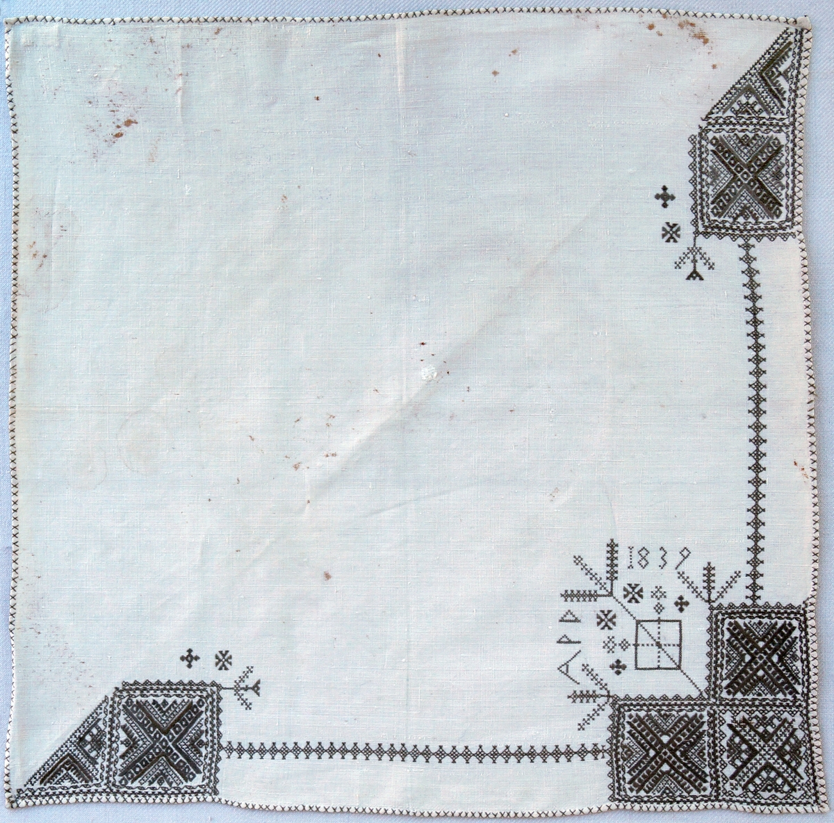 Geometriskt mönster i kvadrater i hörnen, bårder mellan kvadraterna på ryggsnibb och framsnibbarna.