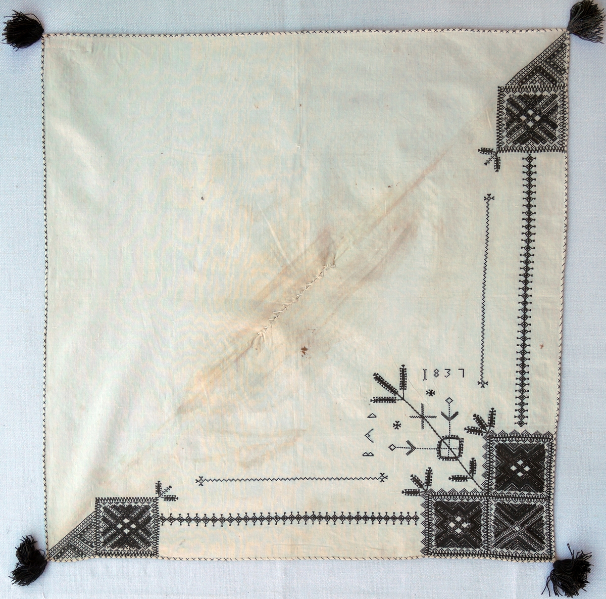 Geometriska mönster i kvadrater i hörnen, båder mellan kvadraterna på ryggsnibb och framsnibbar. På ryggsnibben tre kvadrater och en majstångsspira samt märkning med årtal och initialer. På varje framsnibb en kvadrat och en trekant.