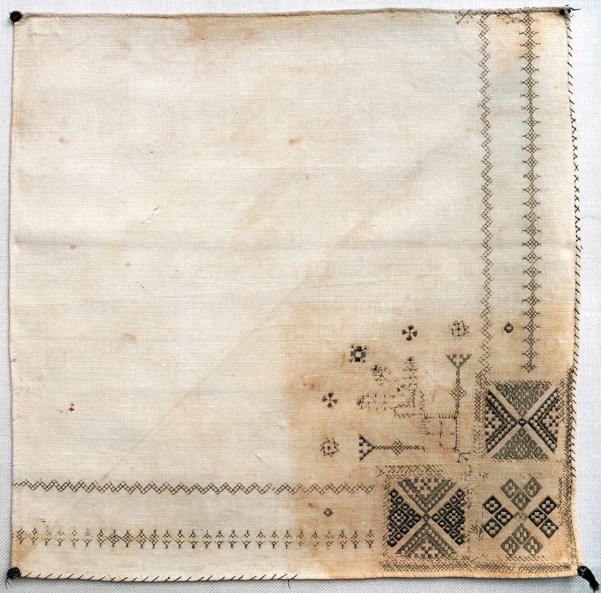 Geometriska mönster i kvadrater i hörnen. På ryggsnibben tre kvadrater och en liten majstångsspira. Inget broderi på framsnibbar men rester av annat broderi på höger framsnibb. Bårder mellan kvadraterna på ryggsnibb och framsnibbar.