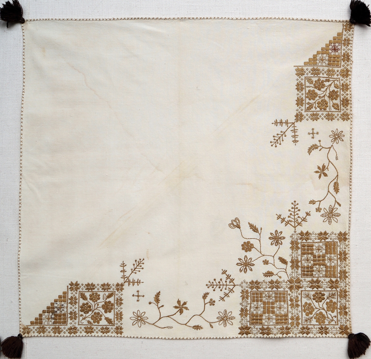 I de tre kvadraterna på ryggstycket är två fyllda med plattsöm och den tredje med ett bloksterlinknande motiv.