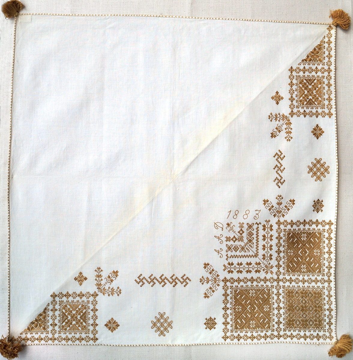 Blomsterliknande och geometriskt mönster samt märkning med årtal och initialer. Bård mellan ryggsnibb och framsnibbar svastikliknande.
