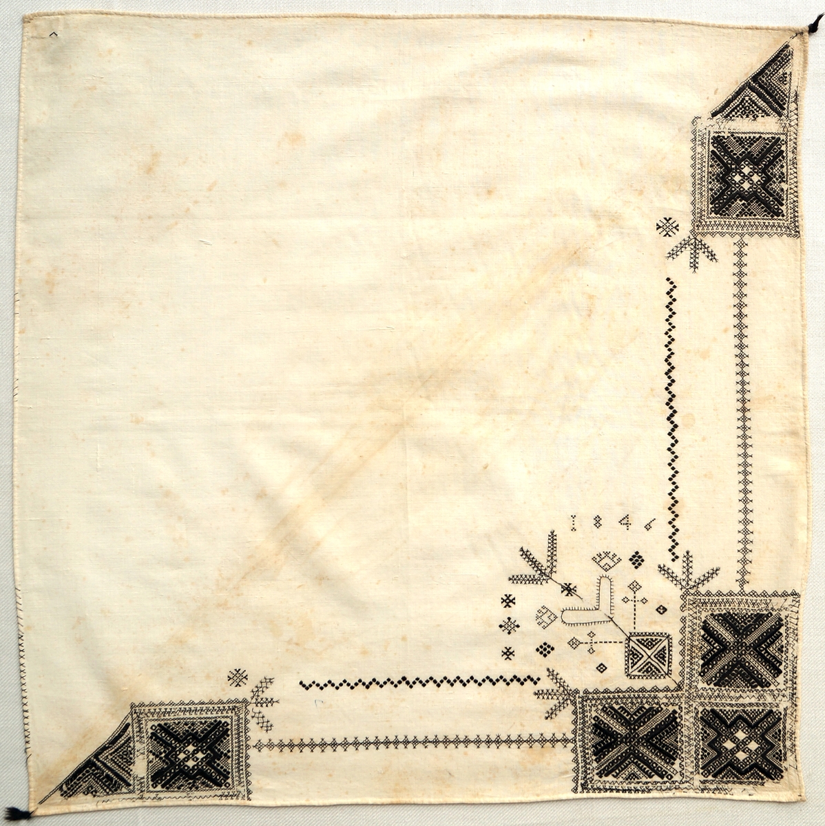 Geometriska motiv i kvadrater i hörnen, bårder mellan kvadraterna på ryggsnibb och framsnibbar.