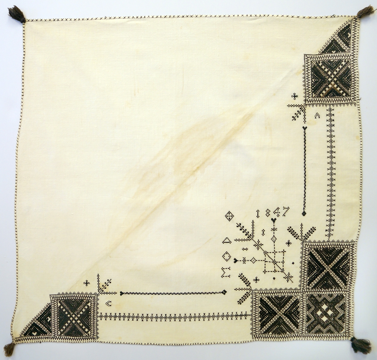 Geometriska mönster i kvadrater i hörnen, bårder mellan kvadraterna på ryggsnibb och framsnibbar.