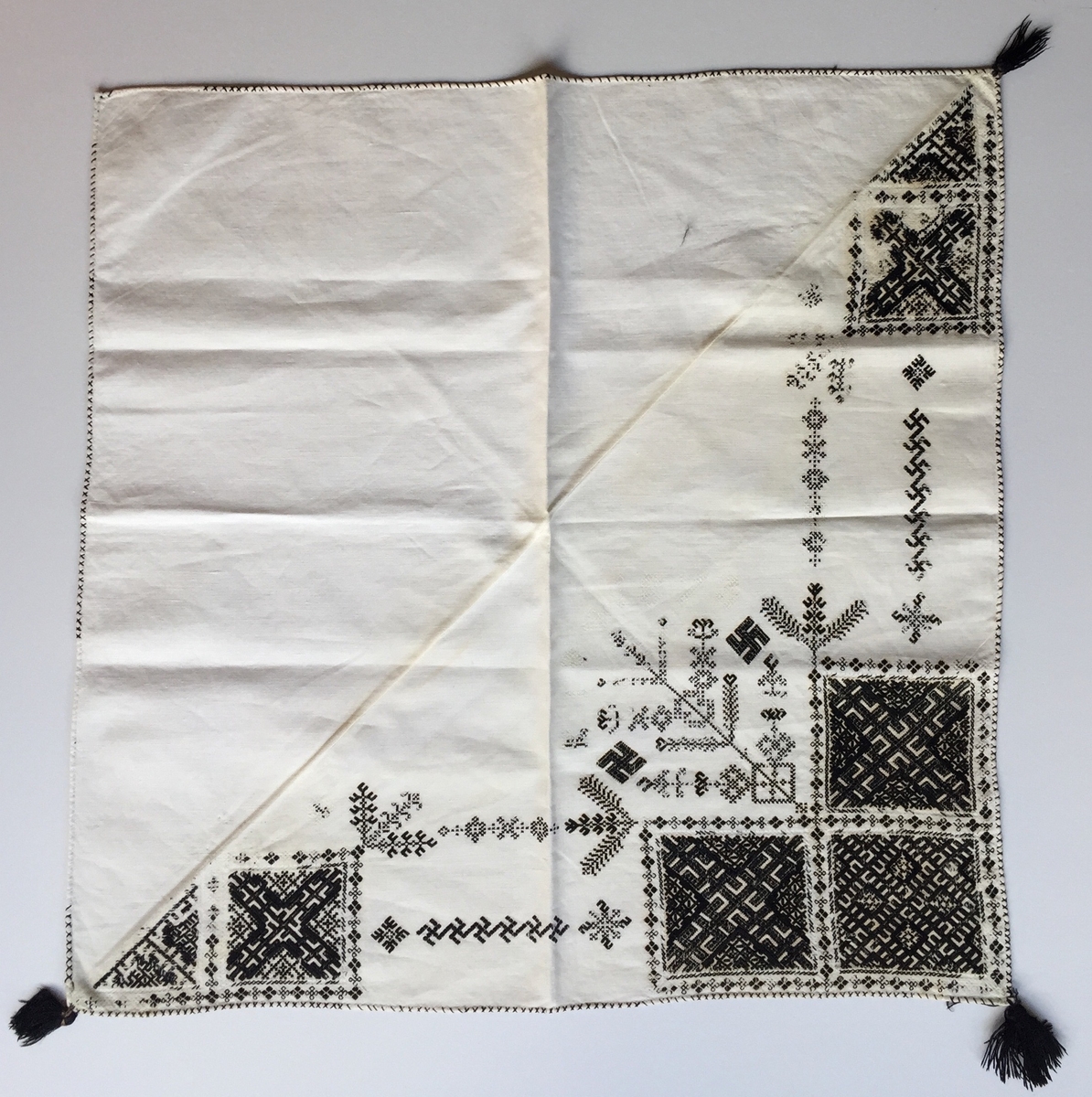 Geometriskt mönster i kvadrater i hörnen, två bårder mellan kvadraterna på ryggsnibb och framsnibbar. På ryggsnibben tre kvadrater och en majstångsspira samt märkning med årtal och initialer (bortnött). På varje framsnibb en kvadrat och en trekant. Sex ornament.