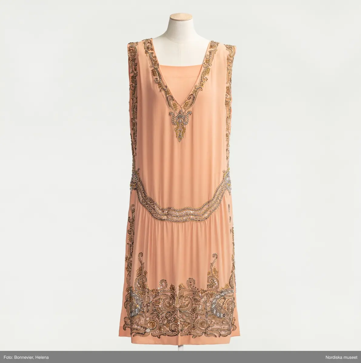 Klänning, monterad på docka, originalmodell från Paris som visades på NK:s Franska damskrädderi hösten 1925. Flapperklänningen av siden är broderad med pärlor, strass, paljetter och metalltrådar. Troligen köpt på utförsäljning av modellplagg i slutet av säsongen av Elisabeth Landtblom (1898-1944).