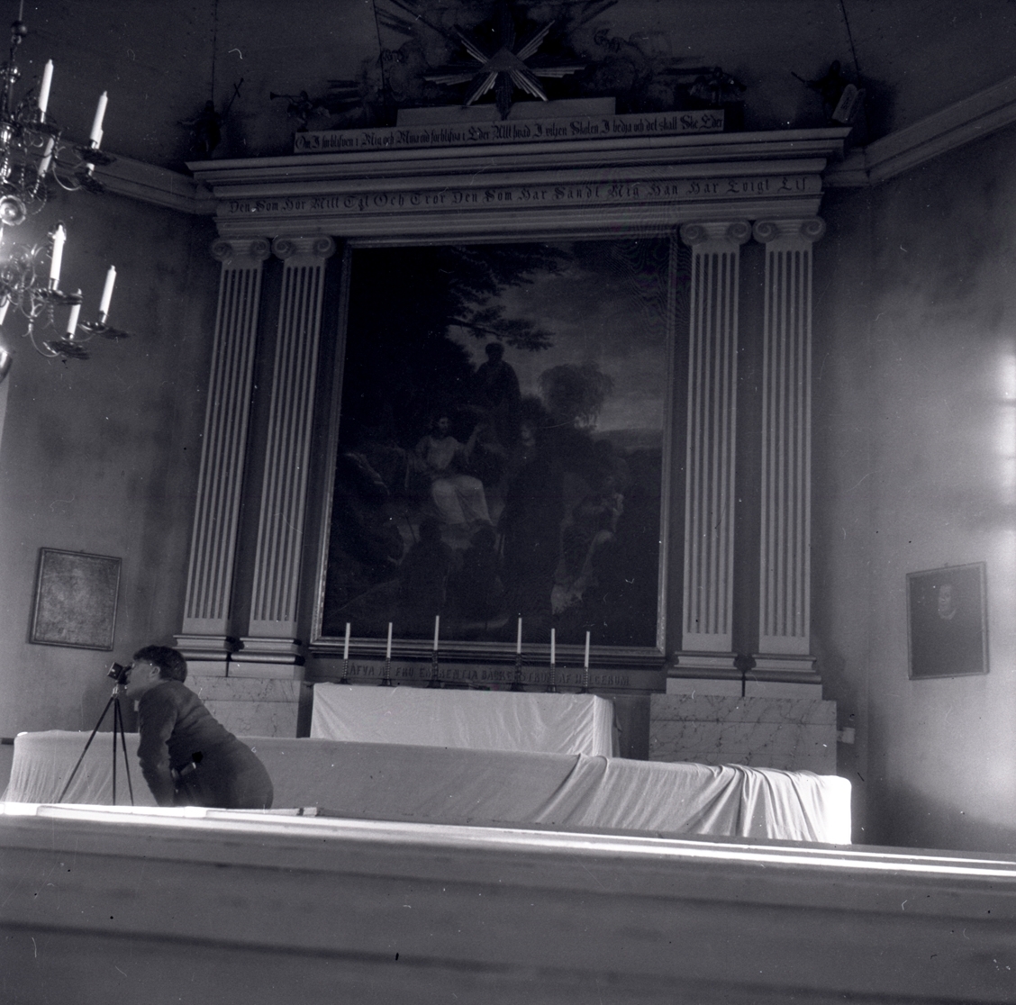 Västrums kyrka. Bilderna visar altaret med altartavla, dopfunt, predikstol, orgelläktare och en ljuskrona.