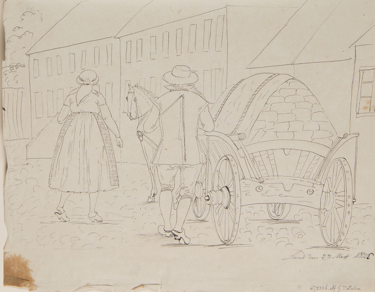 Lund 1826. Stadsbild med män och kvinnor. Baksida man och kvinna med häst och vagn fylld med tegel. Tuschteckningar av G.W Palm