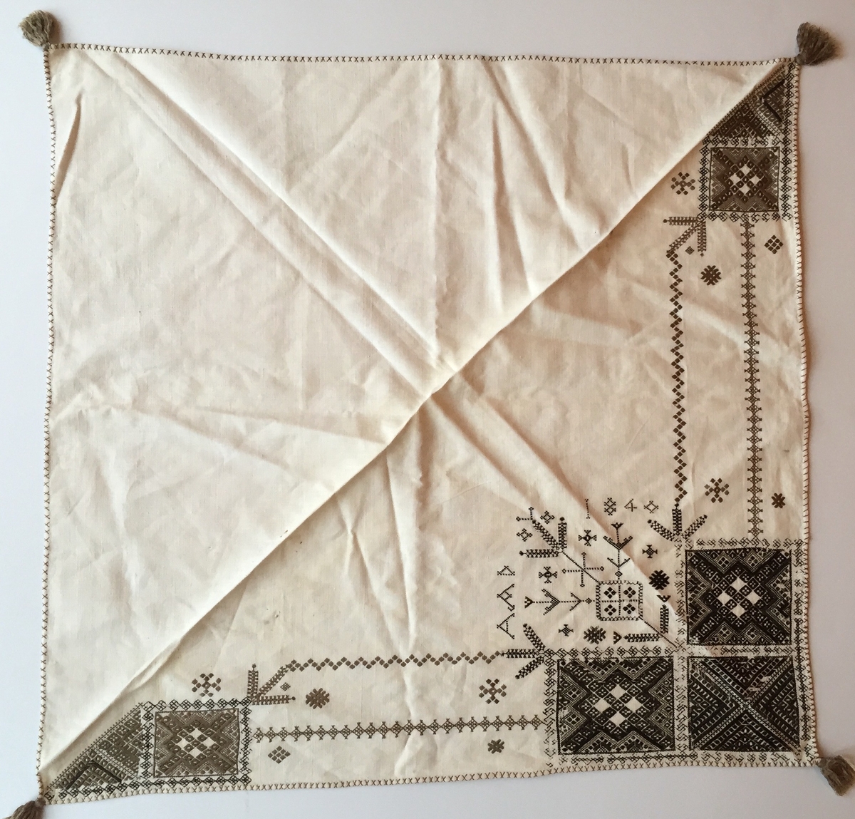 Geometriskt mönster i kvadrater i hörnen. Två bårder mellan kvadraterna på ryggsnibb och framsnibbar. På ryggsnibben tre kvadrater och en majstångsspira samt märkning med årtal och initialer. På varje framsnibb en kvadrat och en trekant. Tolv ornament.