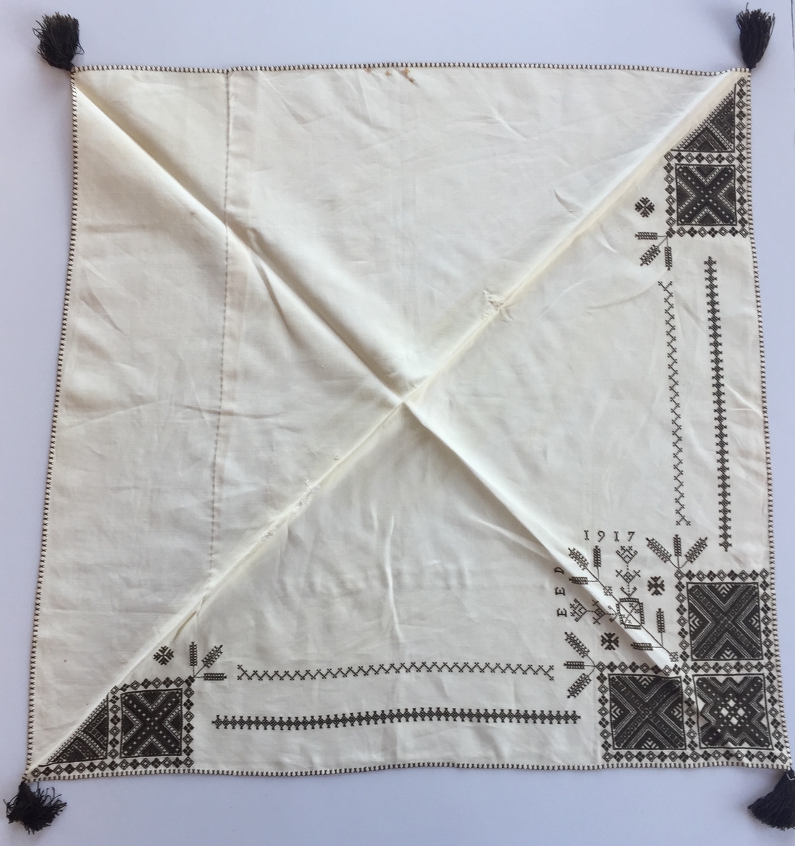Titel: Geometriskt mönster i kvadrater i hörnen. Två bårder mellan kvadraterna på ryggsnibb och framsnibbar. På ryggsnibben tre kvadrater och en majstångsspira samt märkning med årtal och initialer. På varje framsnibb en kvadrat och en trekant. Fyra ornament