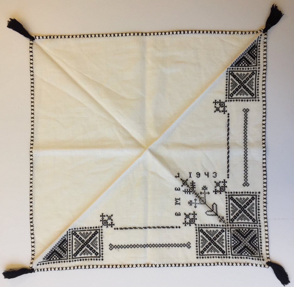 Geometriskt mönster i kvadrater i hörnen, två bårder mellan kvadraterna på ryggsnibben och framsnibbar. På ryggsnibben tre kvadrater och en majstångsspira samt märkning med årtal och initialer. På varje framsnibb en kvadrat och en trekant.