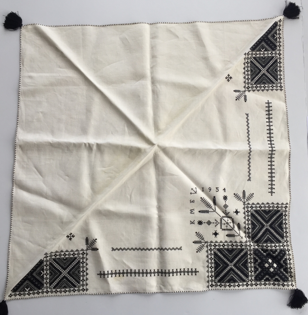 Geometriskt mönste i kvadrater i hörnen. Två bårder mellan kvadraterna på ryggsnibb och framsnibbar. På ryggsnibben tre kvadrater och en majstångsspira samt märkning med årtal och initialer. På varje framsnibb en kvadrat och en trekant. Fem ornament.