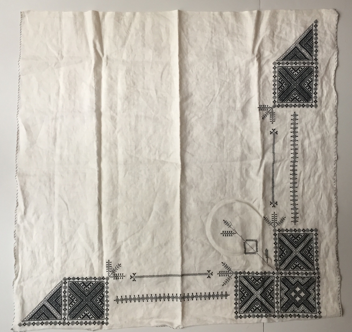 Geometriskt mönster i kvadrater i hörnen. Två bårder mellan kvadraterna på ryggsnibb och framsnibbar. På ryggsnibben tre kvadrater och en påbörjad majstångsspira . På varje framsnibb en kvadrat och en trekant.