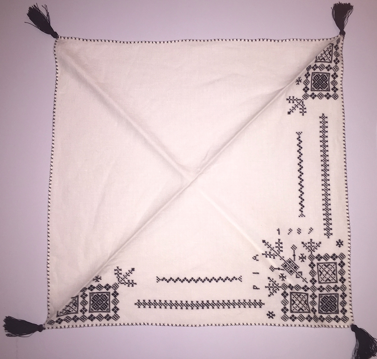 Geometriskt mönster i kvadrater i hörnen. Två bårder mellan kvadraterna på ryggsnibb och framsnibbar. På ryggsnibben tre kvadrater och en majstångsspira samt märkning med årtal och initialer. På varje framsnibb en kvadrat och en trekant. Sex ortnament.