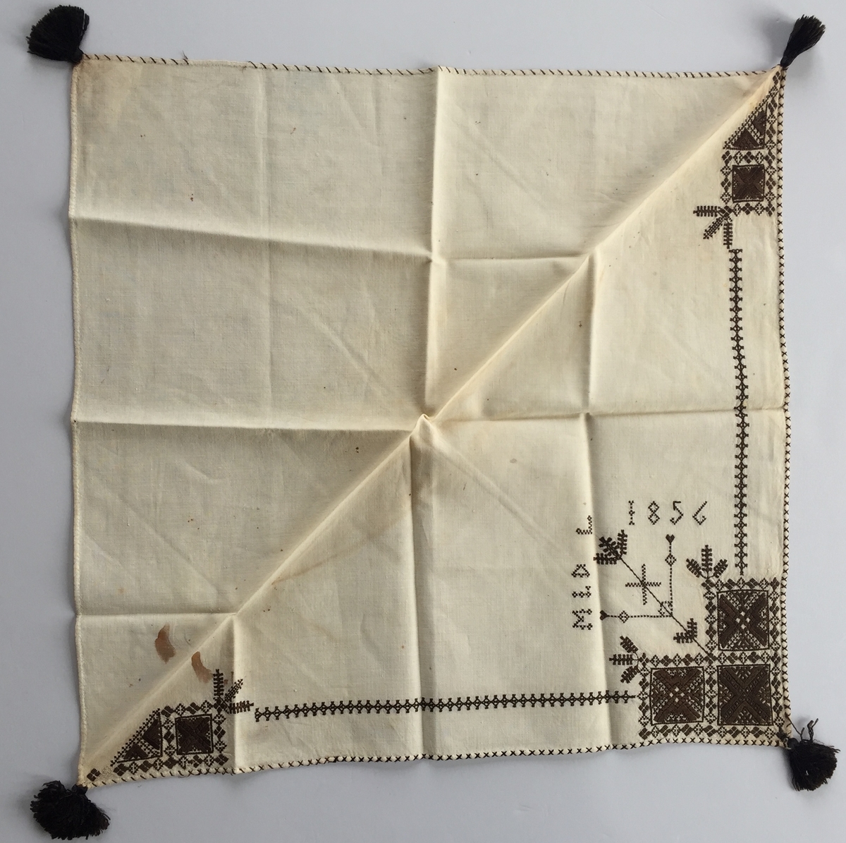 Geometriskt mönster i kvadrater i hörnen.En bård mellan kvadraterna på ryggsnibb och framsnibbar. På ryggsnibben tre kvadrater och en majstångsspira samt märkning med årtal och initialer. På varje framsnibb en kvadrat och en trekant.