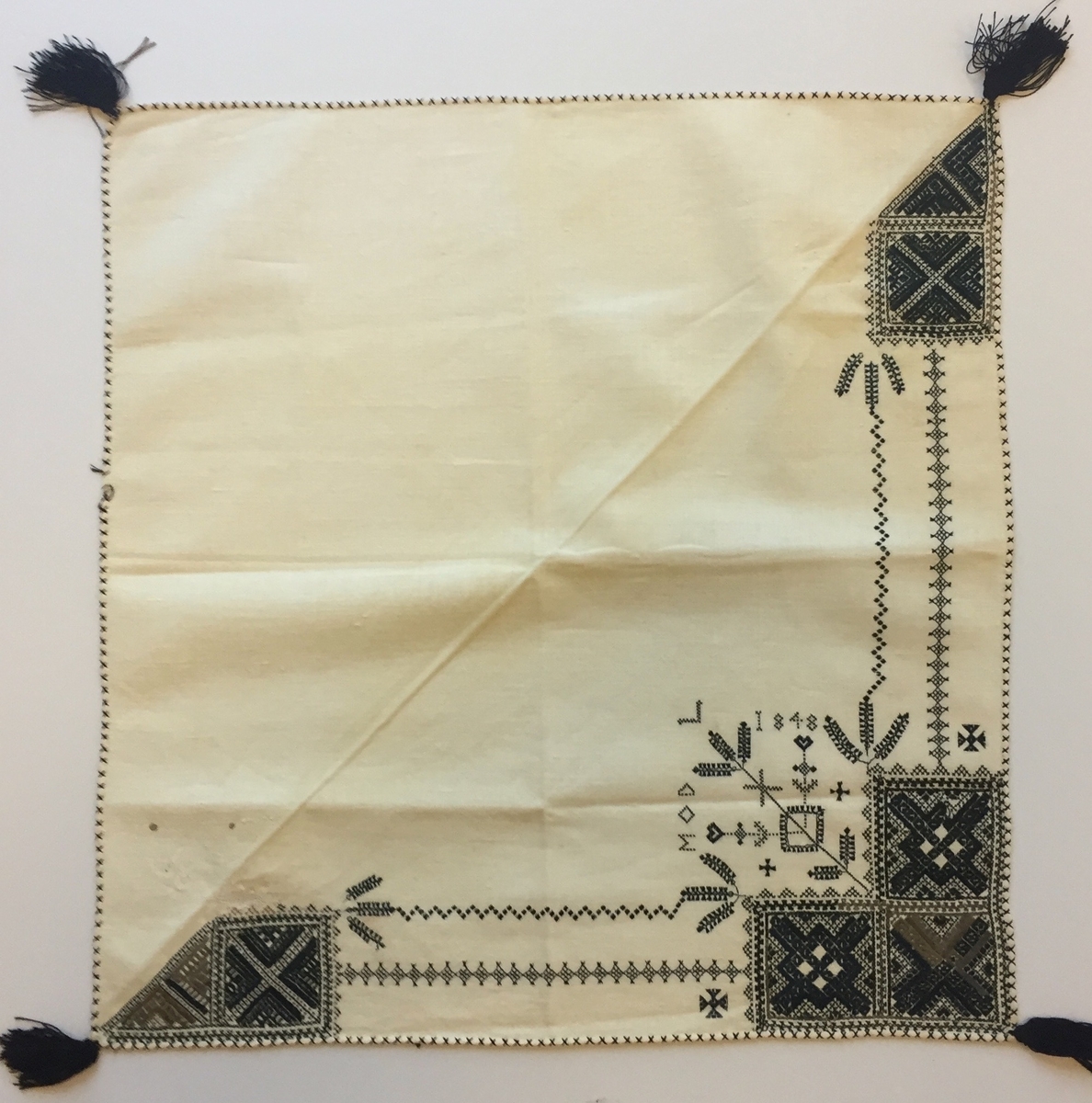 Geometriskt mönster i kvadrater i hörnen. Två bårder mellan kvadraterna på ryggsnibb och framsnibbar. På ryggsnibben tre kvadrater och en majstångsspira samt märkning med årtal och initialer. På varje framsnibb en kvadrat och en trekant. Fem ornament