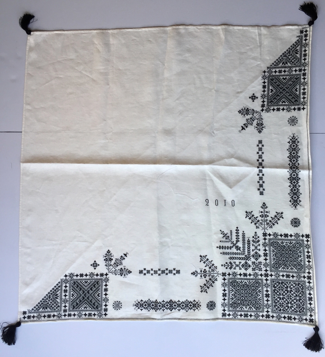 Geometriskt mönster med blomsterliknande motiv. Kvadraterna omges av blomsterliknande bårder, en dekorerade spira. Mellan kvadraterna på ryggsnibb och framsnibbar finns två bårder med blomstermoitv. Sex ornament.