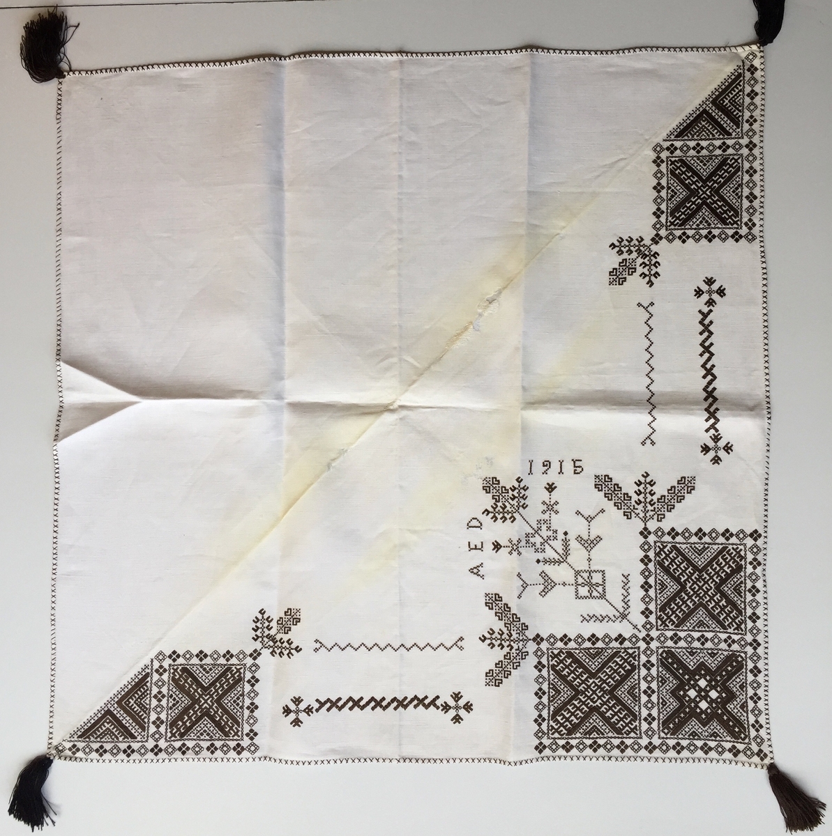 Titel: Geometriskt mönster i kvadrater i hörnen, två bårder mellan kvadraterna på ryggsnibb och framsnibbar. På ryggsnibben tre kvadrater och en majstångsspira samt märkning med årtal och initialer. På varje framsnibb en kvadrat och en trekant.