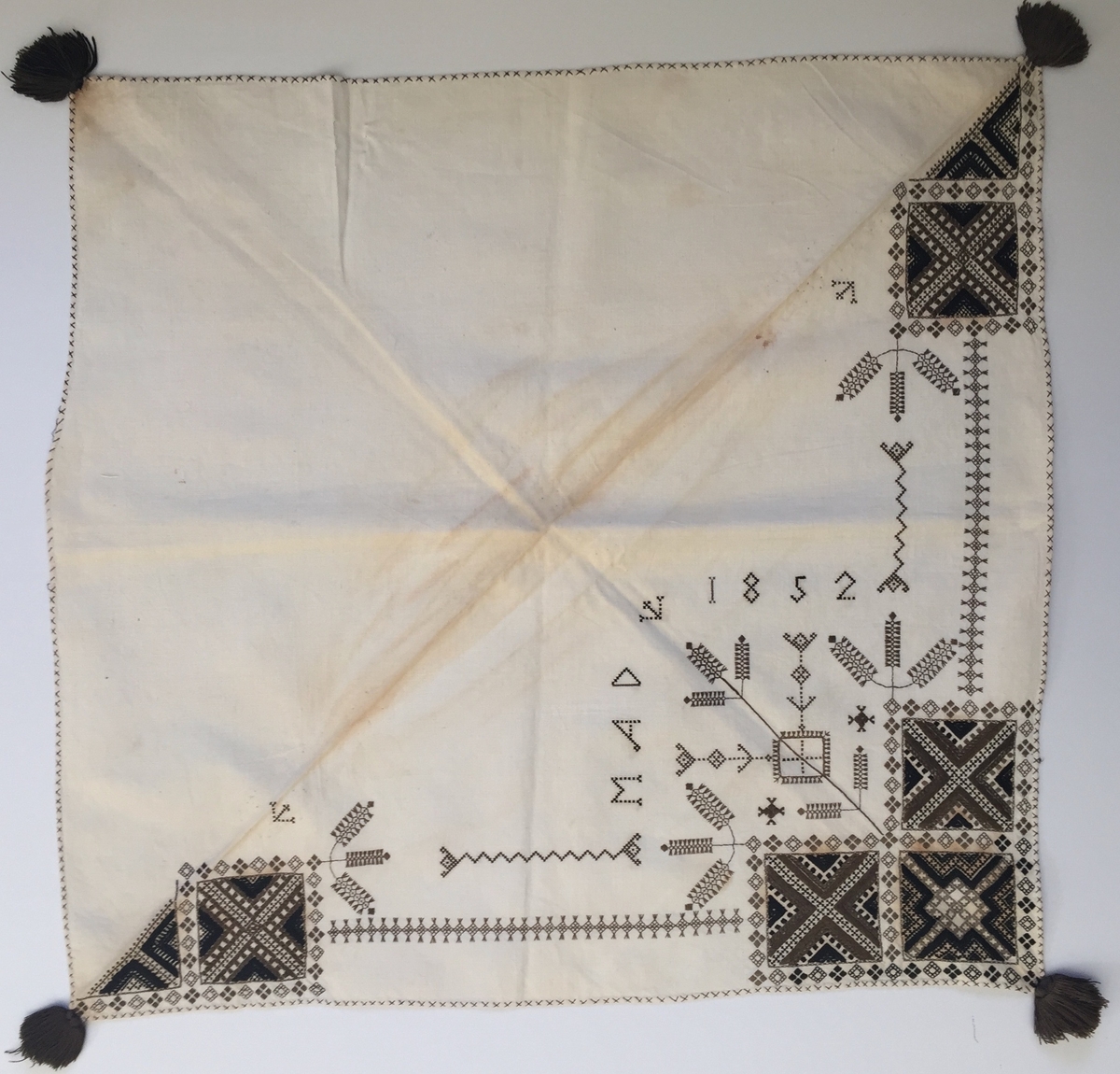Titel: Geometriskt mönster i kvadrater i hörnen, två bårder mellan kvadraterna på ryggsnibb och framsnibbar. På ryggsnibben tre kvadrater och en majstångsspira samt märkning med årtal och initialer. På varje framsnibb en kvadrat och en trekant. Fem ornament.