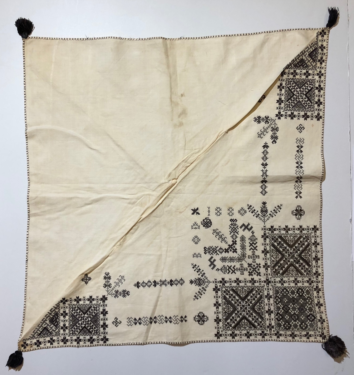 Blomsterinspirerat mönster i kvadrater i hörnen. Runt kvadraterna bård i blomstermotiv. Mellan kvadraterna på ryggsnibb och framsnibbar två bårder. På ryggsnibben tre kvadrater och en dekorerad majstångsspira. På varje framsnibb en kvadrat och en trekant. Nio ornament