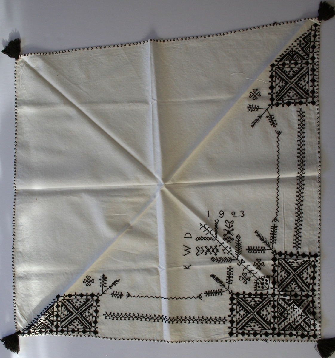 Enkelt, nästan naivistiskt geometriskt mönster i kvadrater i hörnen, två bårder mellan kvadraterna på ryggsnibb och framsnibbar. På ryggsnibben tre kvadrater och en majstångsspira samt märkning med årtal och initialer. På varje framsnibb en kvadrat och en trekant. Fyra ornament.