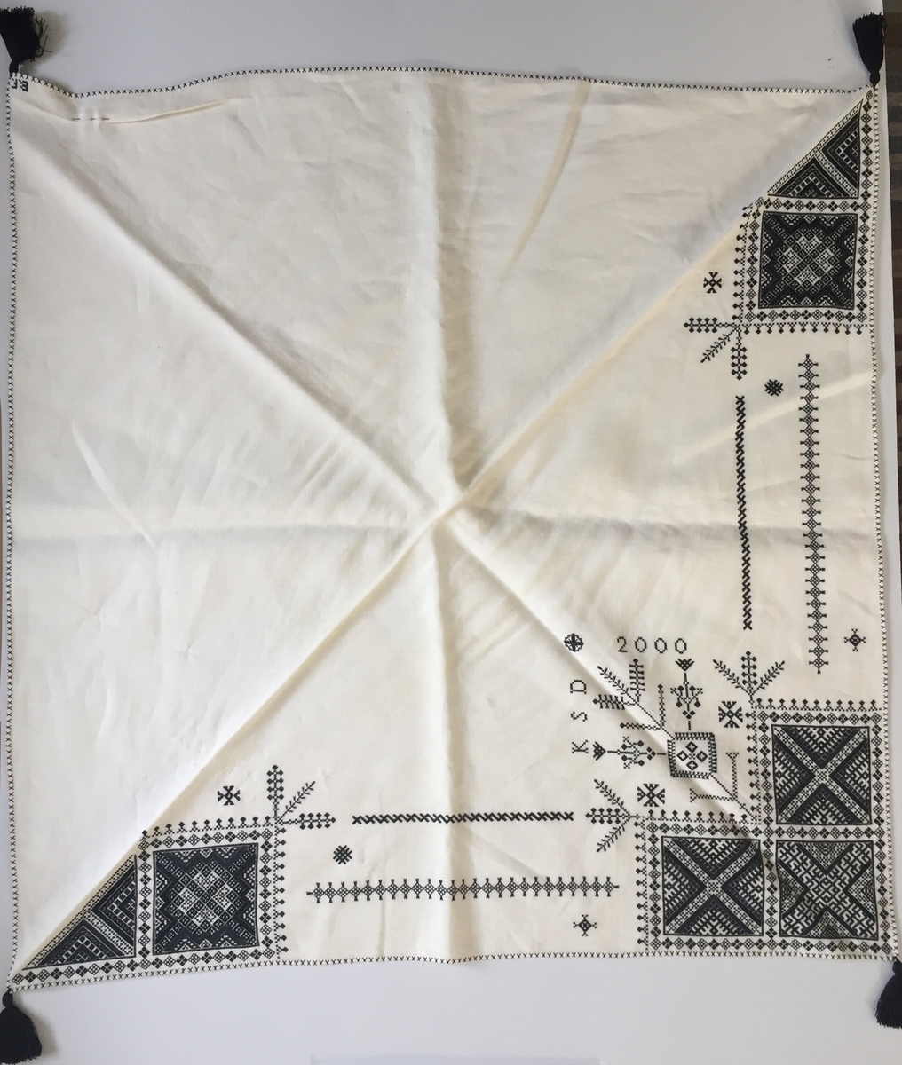 Geometriskt mönster i kvadrater i hörnen, två bårder mellan kvadraterna på ryggsnibb och framsnibbar. På ryggsnibben tre kvadrater och en majstångsspira samt märkning med årtal och initialer. På varje framsnibb en kvadrat och en trekant. Nio ornament.