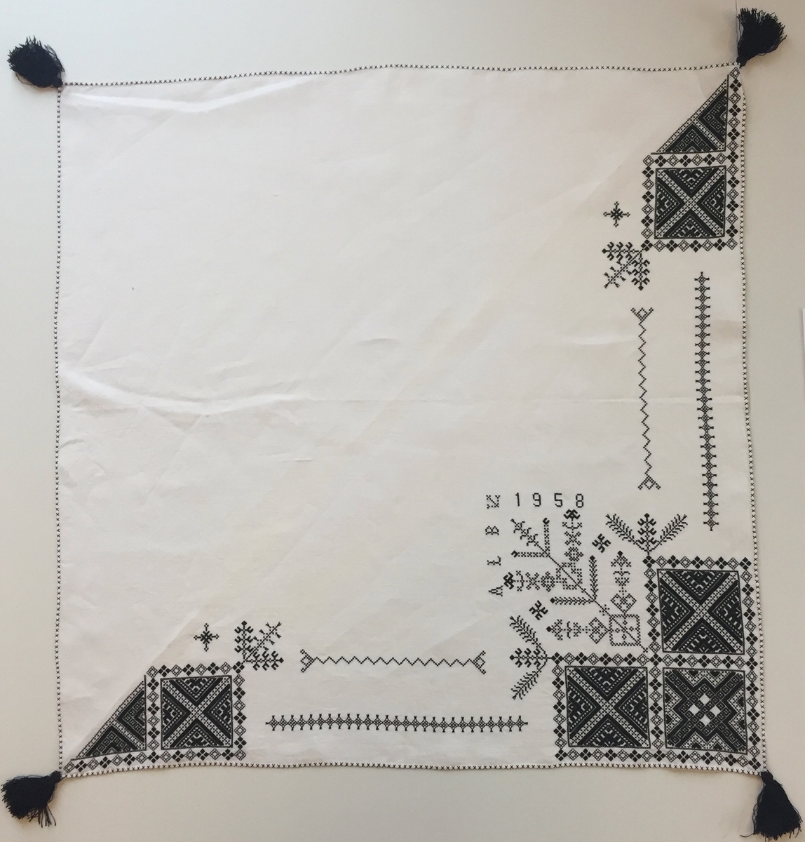 Geometriskt mönster i kvadrater i hörnen. Två bårder mellan kvadraterna på ryggsnibb och framsnibbar. På ryggsnibben tre kvadrater och en majstångsspira samt märkning med årtal och initialer. På varje framsnibb en kvadrat och en trekant. Fem ornament
