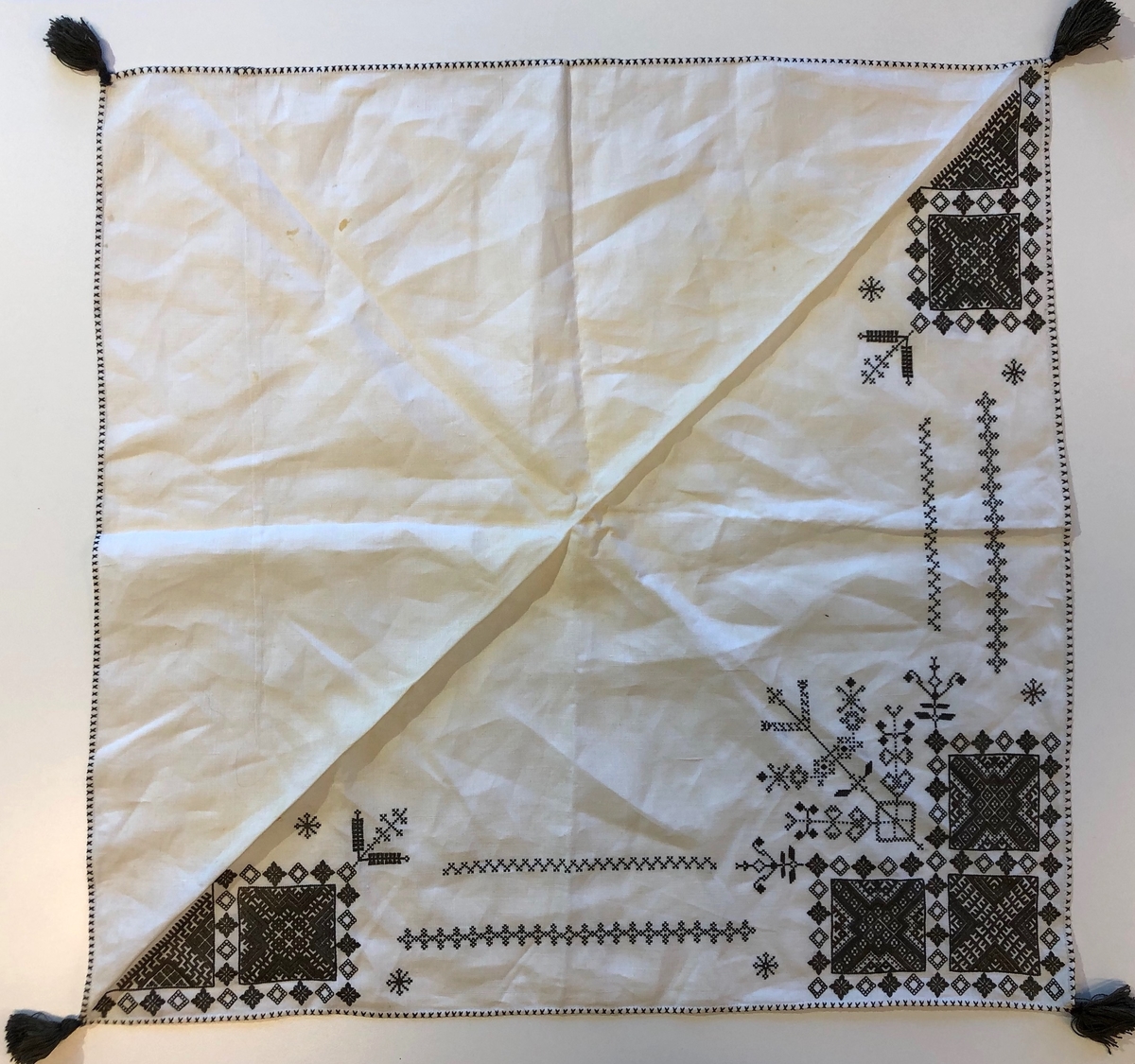 Geometriskt mönster i huvudsak i rätlinjig plattsöm i kvadrater i hörnen. Två bårder mellan kvadraterna på ryggsnibb och framsnibbar. På ryggsnibben tre kvadrater och en majstångsspira samt märkning med årtal och initialer. På varje framsnibb en kvadrat och en trekant. Sex ornament