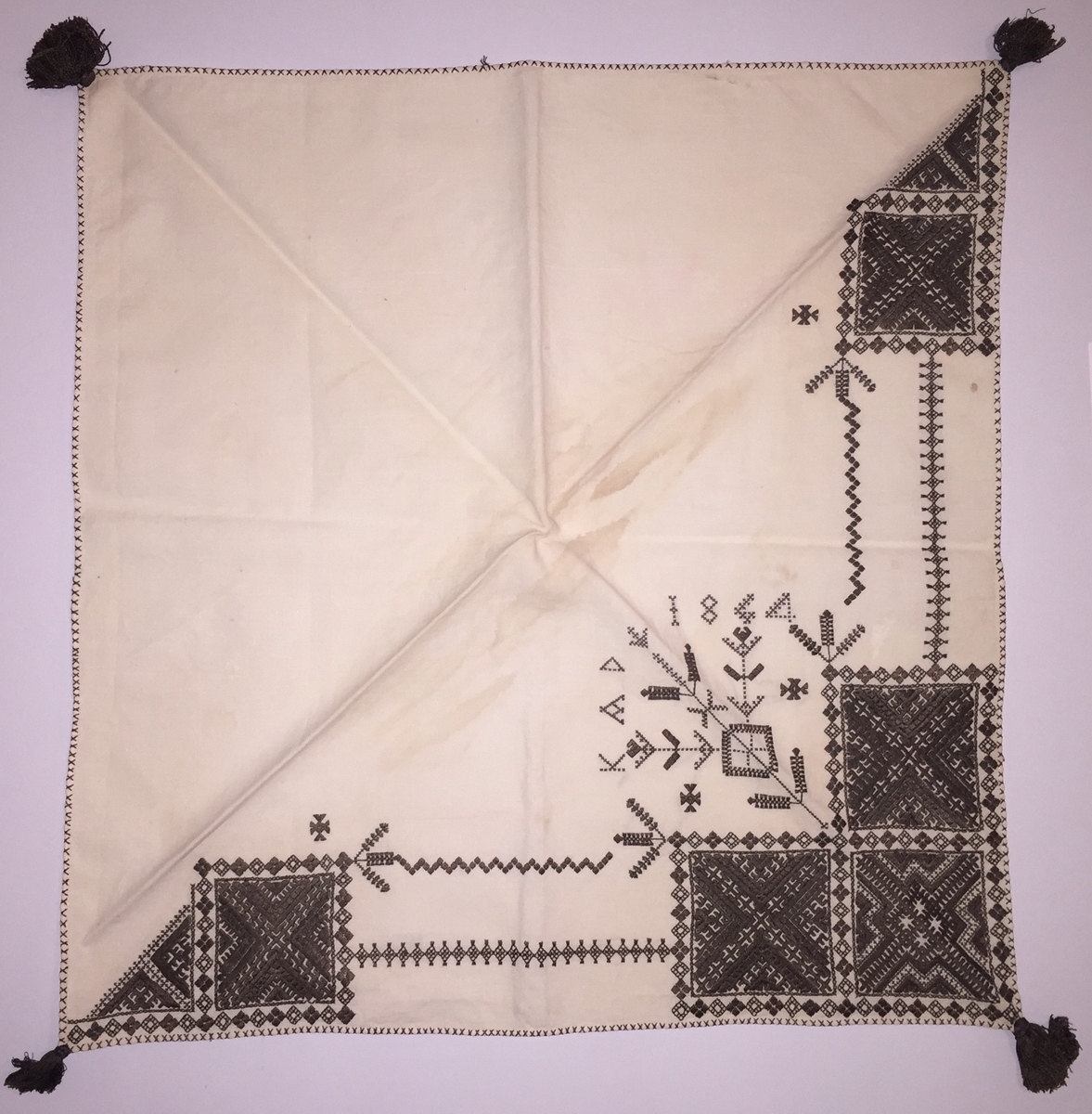 Geometriskt mönster i kvadrater i hörnen huvudsakligen i rätlinjig plattsöm. Två bårder mellan kvadraterna på ryggsnibb och framsnibbar. På ryggsnibben tre kvadrater och en majstångsspira samt märkning med årtal och initialer. På varje framsnibb en kvadrat och en trekant. Fyra ortnament.