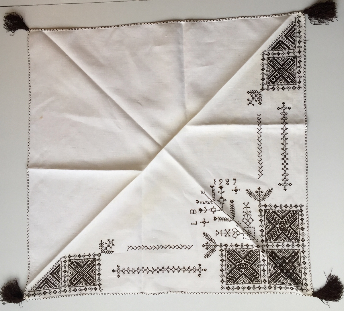 Geometriskt mönster i kvadrater i hörnen, två bårder mellan kvadraterna på ryggsnibb och framsnibbar. På ryggsnibben tre kvadrater och en majstångsspira samt märkning med årtal och initialer. På varje framsnibb en kvadrat och en trekant. Två ornament.