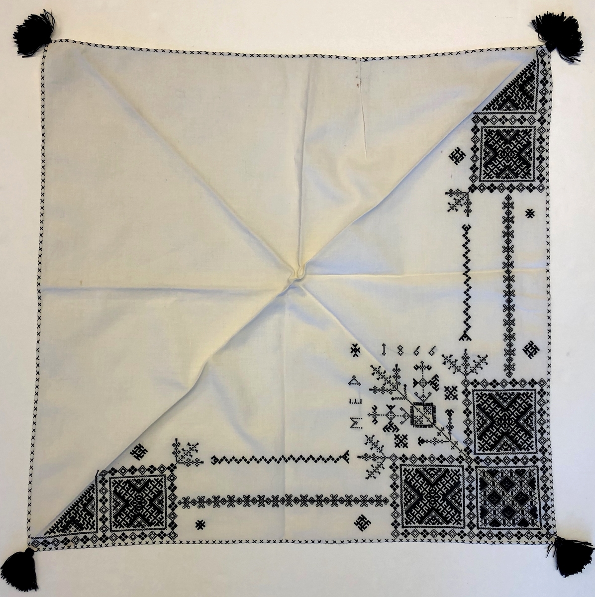 Titel: Geometriskt mönster i kvadrater i hörnen. Två bårder mellan kvadraterna på ryggsnibb och framsnibbar. På ryggsnibben tre kvadrater och en majstångsspira samt märkning med årtal och initialer. På varje framsnibb en kvadrat och en trekant. Nio ornament
