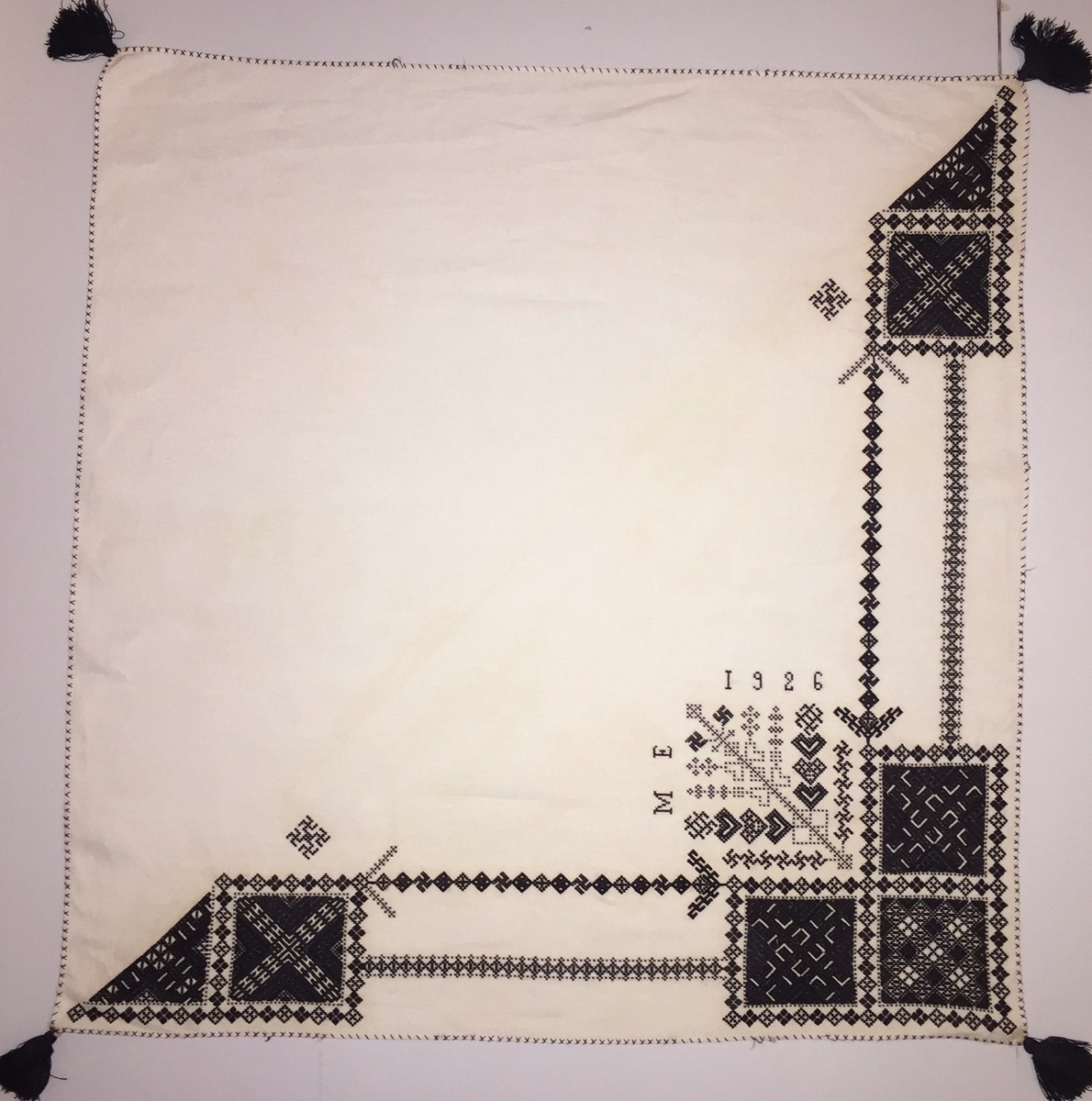Geometriskt mönster i kvadrater i hörnen, huvudsakligen i rätlinjig plattsöm. Två bårder mellan kvadraterna på ryggsnibb och framsnibbar. På ryggsnibben tre kvadrater och en fyrkantig majstångsspira . På varje framsnibb en kvadrat och en trekant. Två ortnament.