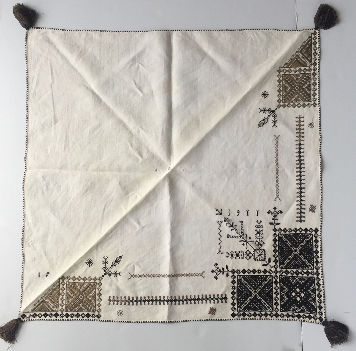 Geometriskt mönster i kvadrater i hörnen. Två bårder mellan kvadraterna på ryggsnibb och framsnibbar. På ryggsnibben tre kvadrater och en majstångsspira samt märkning med årtal. På varje framsnibb en kvadrat och en trekant. Sex ornament.